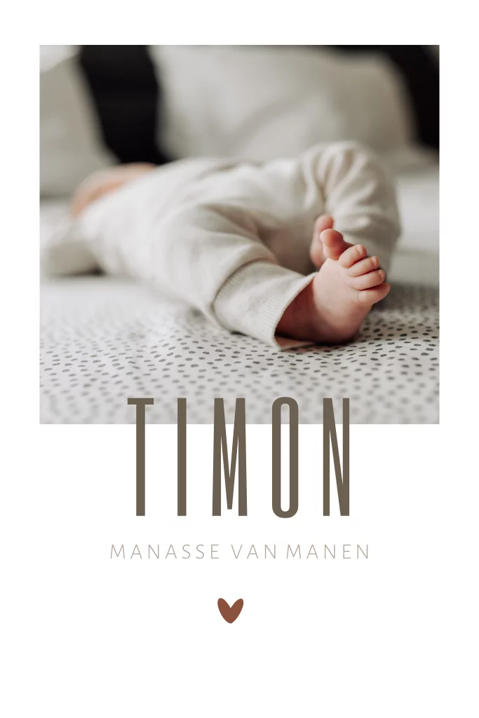 Foto geboortekaartje met ruimte voor een eigen foto. De naam staat een beetje over de foto hen en onderaan staat een roestbruin hartje.