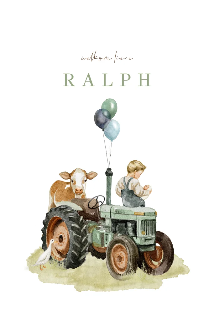 Hoera, een broertje erbij! En wat is er leuker dan dat vieren met een geboortekaartje vol boerderij pret? Dit handgetekende kaartje laat een gezellige boerderijsfeer zien, compleet met een stoere tractor, een lieve koe en natuurlijk de grote broer die trots zijn babybroertje vasthoudt. De ballonnen maken het kaartje extra feestelijk.