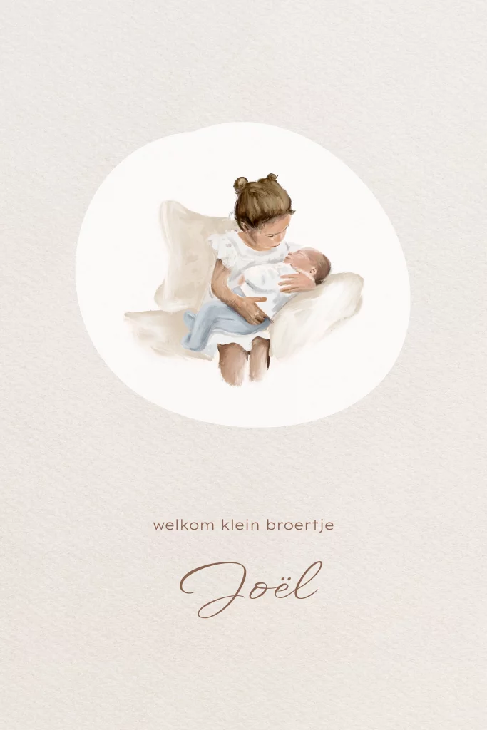 Olieverf geboortekaartje met een unieke illustratie van een zusje met een baby broertje op de bank. Deze prachtige tekening kan je ook aanpassen naar een andere gezinssamenstelling. Pas het geboortekaartje met jullie gezin aan in de editor met eigen gegevens en bestel een proefdruk.