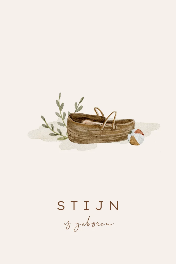 Zoek je een lief geboortekaartje voor een jongen, dan is dit vast wat voor je. Op het kaartje staat een aquarel tekening van een baby in een mandje. Bij de mand staan groene takjes en er ligt een bal. Echt een super tof babykaartje voor jullie zoon. Het kaartje wordt afgewerkt met ronde hoeken, dat maakt het helemaal af!