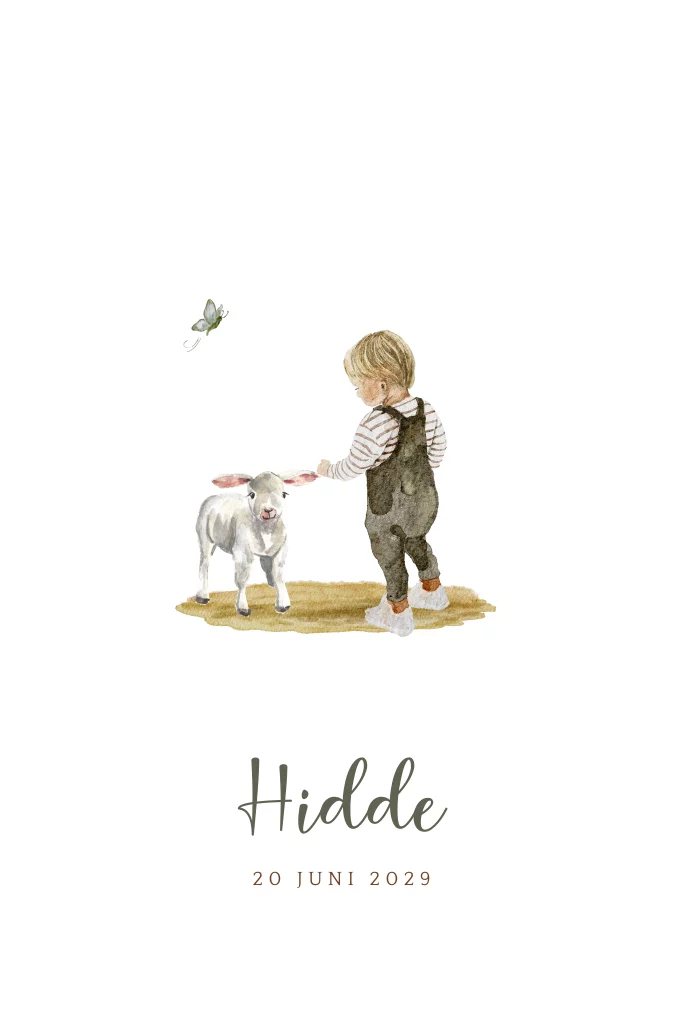Woon je op een boerderij en krijgen jullie een zoon? Dit originele geboortekaartje ast daar goed bij. Op het kaartje staat een getekend jongetje met een tuinbroekje aan bij een lief lammetje. In de lucht vliegt een vlinder. Dit babykaartje heeft ronde hoeken.