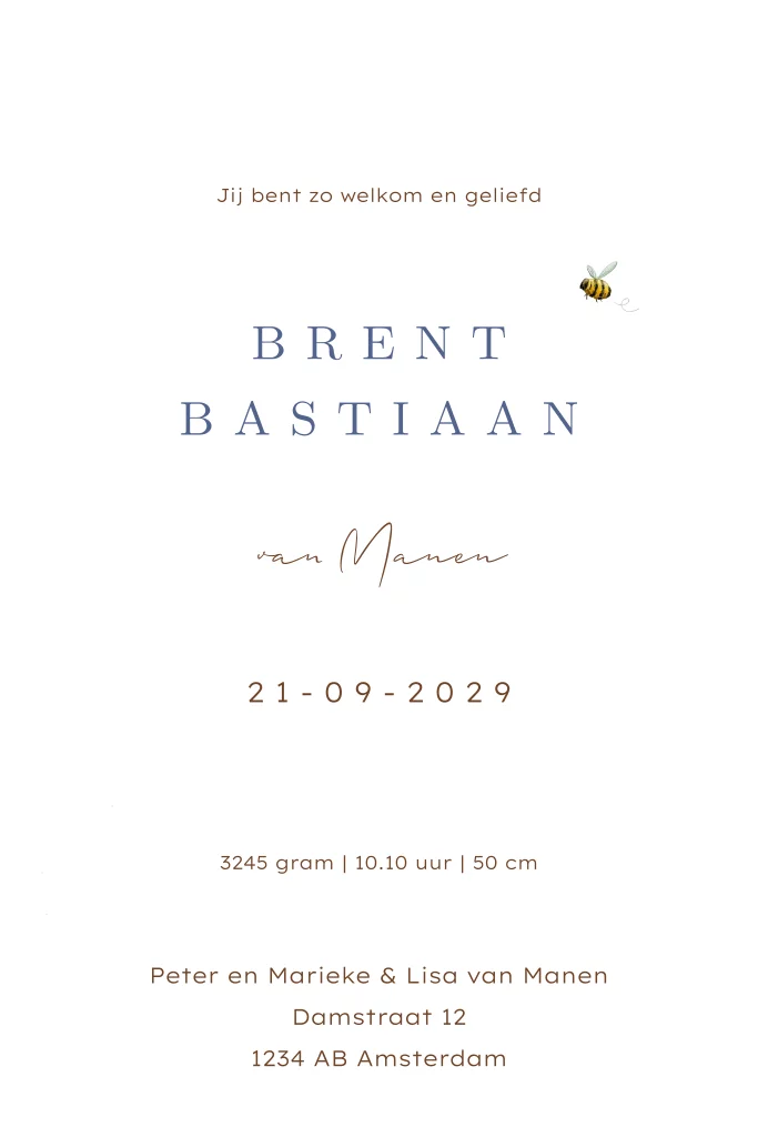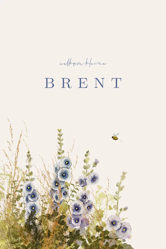 Uniek getekend geboortekaartje met stokrozen in een stoere kleur blauw. Er vliegt een bijtje door de lucht die dit jongenskaartje een zomerse uitstraling geeft. Dit staande dubbele kaartje is leuk voor een jongen. De illustratie is gemaakt met waterverf wat het kaartje een heel mooie look geeft.