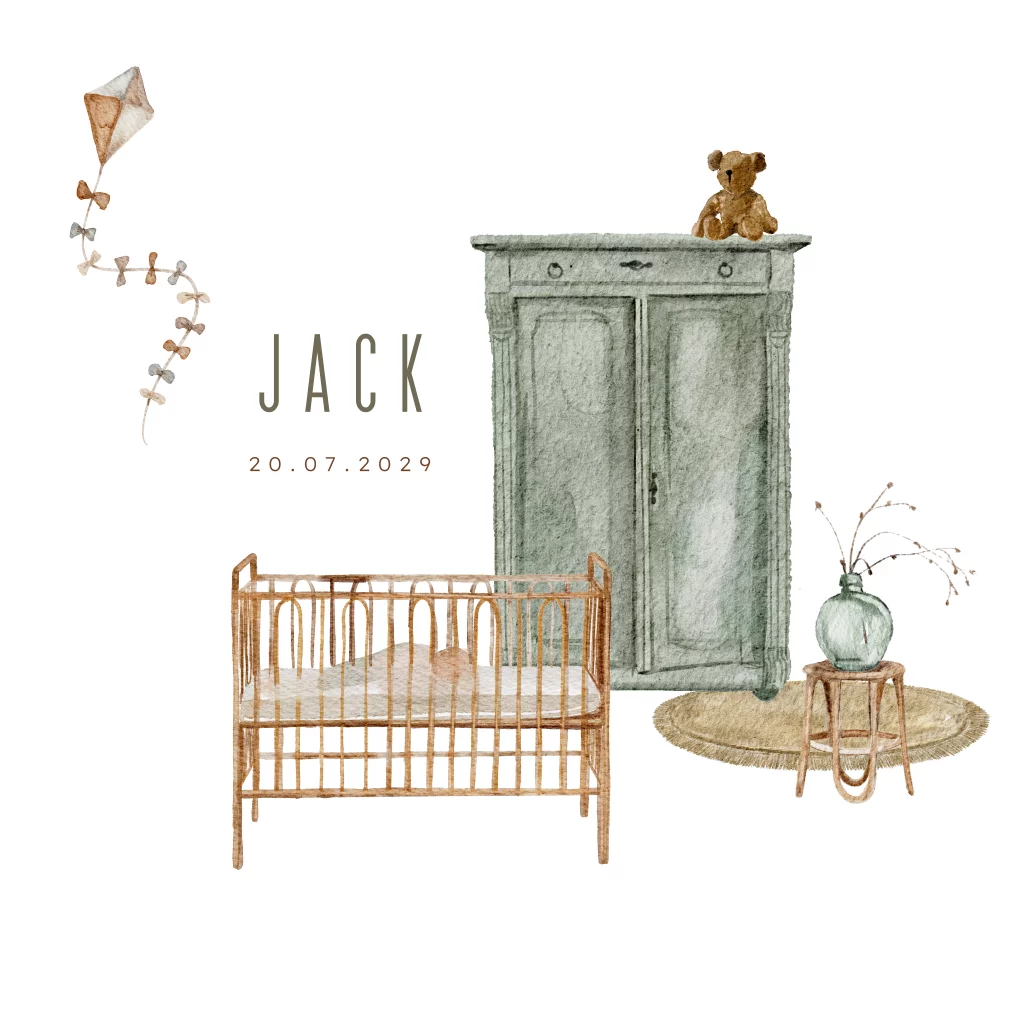 Uniek geboortekaartje voor een jongen met illustraties van een kinderkamer en een baby in een ledikantje. Alle tekeningen staan los op het kaartje zodat je het naar wens kunt aanpassen.