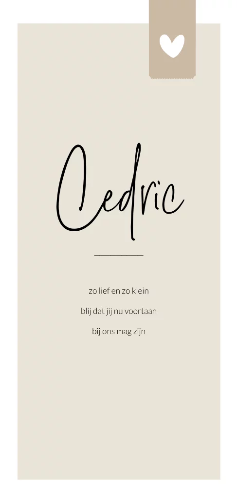 Geboortekaartje in een enkel formaat met een witte rand. Bovenaan is een bruin label gedrukt met een wit hartje. Dit kaartje kan je zelf helemaal aanpassen.
