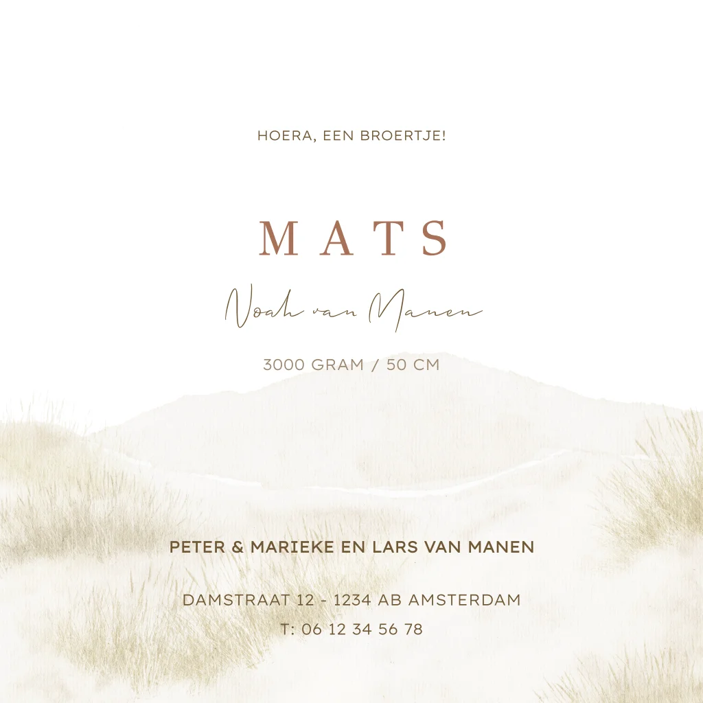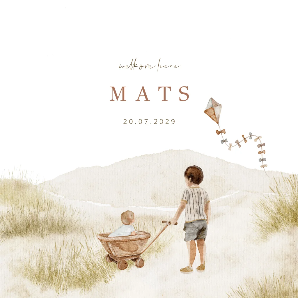 Geboortekaartje voor een tweede kindje in een zomer thema. De achtergrond is een illustratie van getekende duinen. Daarop staat een ouder broertje met een kar met een baby. In de lucht een vrolijke vlieger. Dit schattige babykaartje is helemaal zelf aan te passen als je een andere gezinssamenstelling hebt.