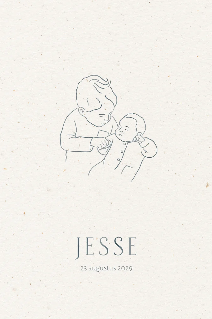 Geboortekaartje lijntekening van een broer met een baby. De tekening is in een blauwe hoogglans kleur, je kunt dit zelf aanpassen in kleur. Lief kaartje voor een tweede kindje.