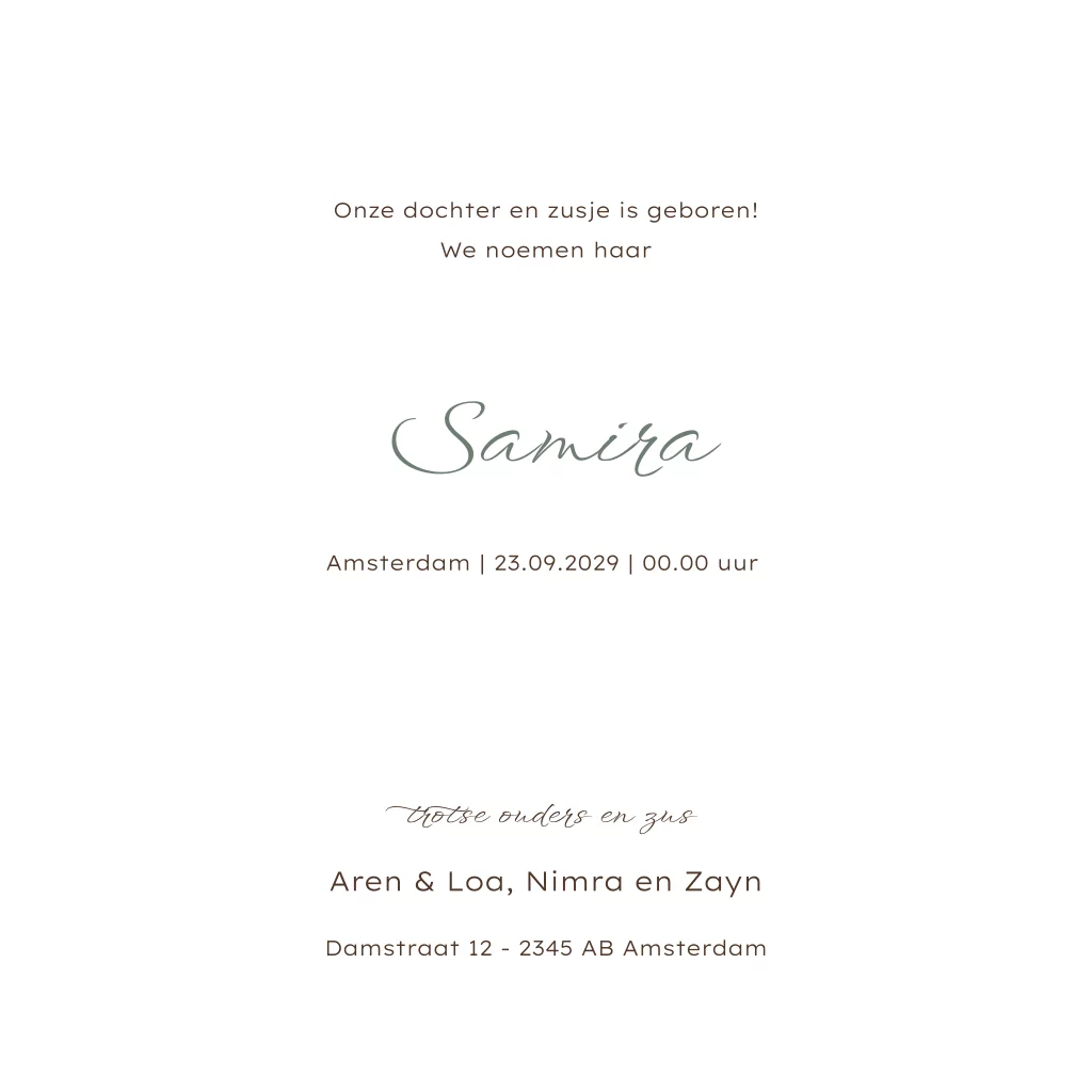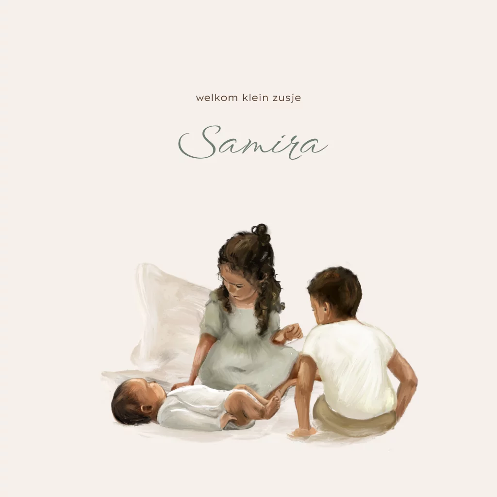 Multicultureel geboortekaartje voor een derde kindje. Je ziet op het kaartje een baby op de bank en daarbij een oudere broer en zus. Je kunt de illustraties ook aanpassen en vervangen door andere kindjes als jullie gezinssamenstelling anders is. Heb je hier hulp bij nodig horen we het graag!