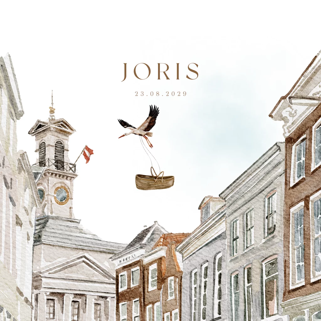 Een vierkant geboortekaartje voor een baby in Dordrecht. Dit kaartje is getekend door onze Dordtse illustrator en daarom heel toepasselijk voor baby's in Dordrecht. Ook nog eens heel uniek want nergens anders vind je dit soort kaartjes. Een ooievaar komt vliegend door de lucht deze baby in de stad brengen. Ook leuk te combineren met goudfolie of andere kleuren folie.