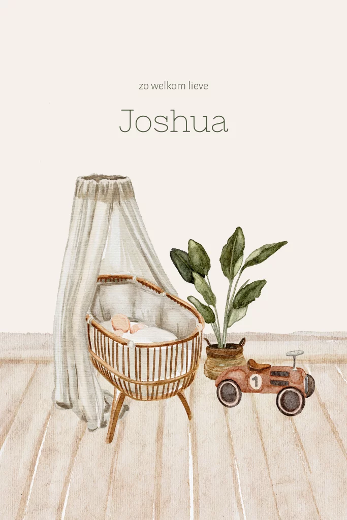 Geboortekaartje met een wiegje en een baby. Het wiegje staat in een kamertje met houten vloer. Op de grond staat een kamerplant en een loopauto. De illustraties zijn handgetekend en staan los op het kaartje. Je kunt het hele kaartje zelf bewerken en aanpassen.