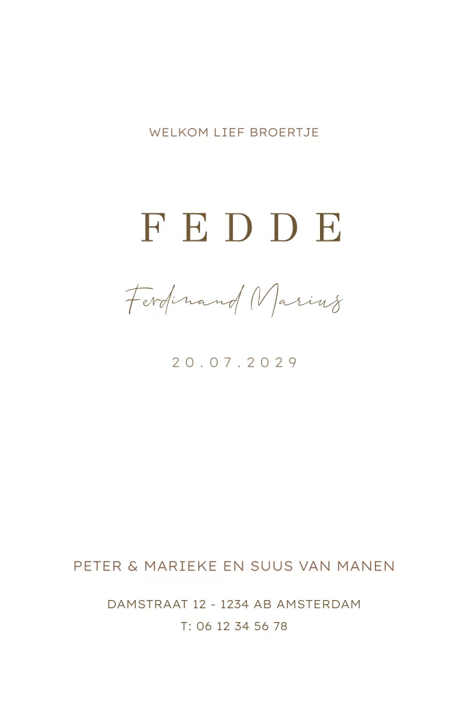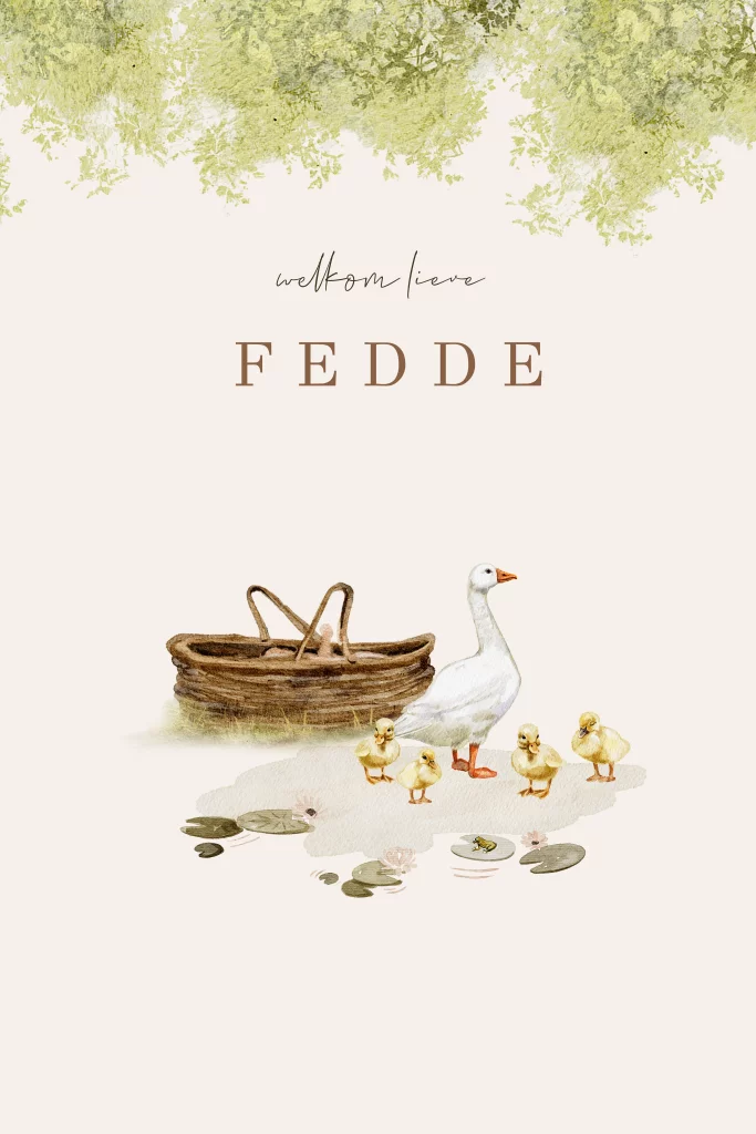 Lief lente geboortekaartje met een gans en kuikentjes. Daarbij een mandje met een baby. Je kunt dit kaartje zelf aanpassen en gebruiken voor jongen of meisje.