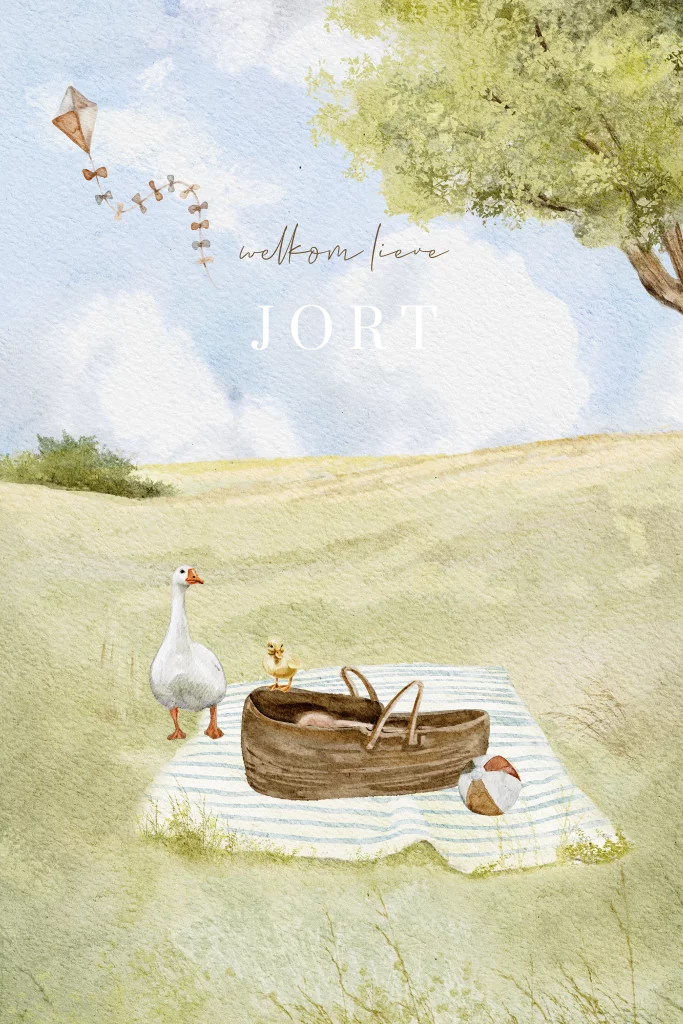 Ben je op zoek naar een uniek en origineel geboortekaartje? Kijk dan niet verder! Dit lentegeboortekaartje met getekende aquarel illustraties is precies wat je zoekt. De prachtige Hollandse willen luchten, het grasland met de boom en de vrolijke vlieger in de lucht maken dit kaartje helemaal af. Bij de babymand staat een schattige gans met een kleintje dat op de mand zit. Je kunt dit kaartje helemaal naar wens aanpassen door illustraties toe te voegen of weg te halen. Dit kaartje is perfect voor een lentebaby! De frisse kleuren en het vrolijke vooruitzicht op een mooie lente maken dit kaartje helemaal af. De babymand met het schattige kleine kuikentje erin is een echt eye-catcher. Je kunt de tekst helemaal naar wens aanpassen, zodat het kaartje precies past bij jouw bijzondere gebeurtenis.