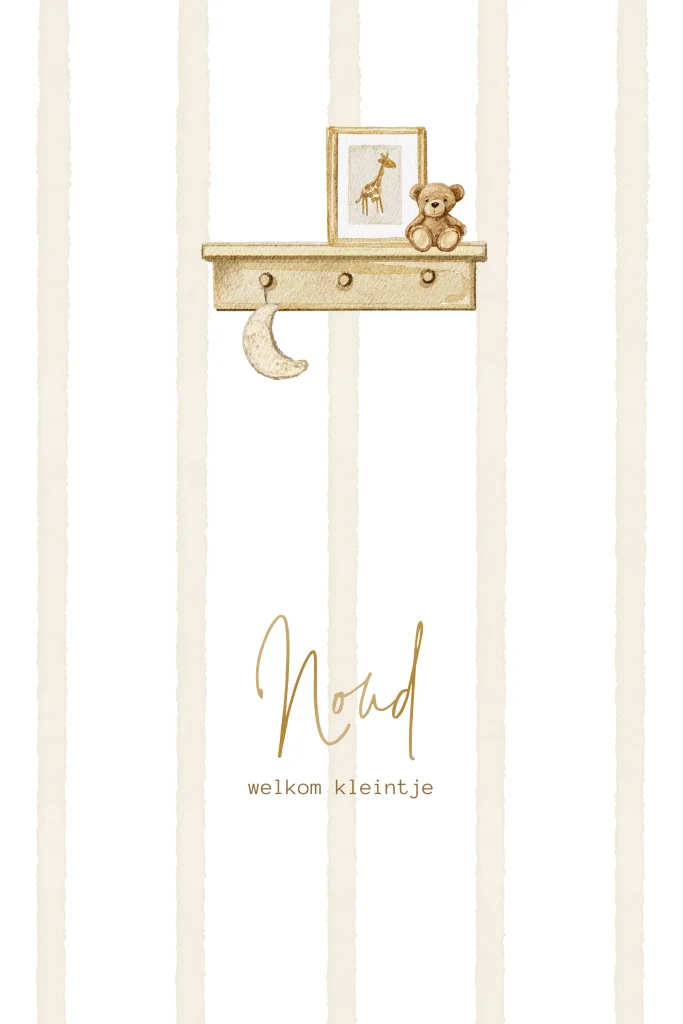 Lief geboortekaartje voor een jongen. De achtergrond heeft beige strepen en daarop staat de naam van jullie zoon in een donkere bruine kleur. Onderaan het kaartje staat plankje voor een babykamer met een schilderijtje en een beer. Je kunt alle kleuren en illustraties eenvoudig aanpassen in onze editor.