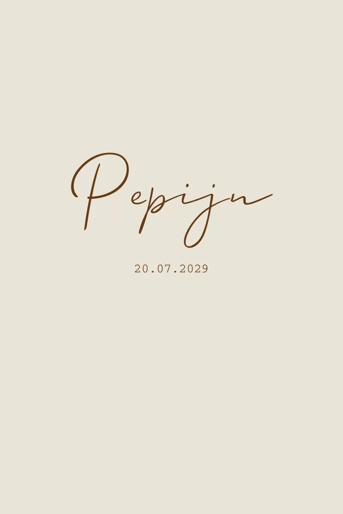 Strak unisex geboortekaartje met een taupe achtergrond en de naam in handgeschreven lettertype. De achtergrond kleur van dit kaartje kan je zelf aanpassen.