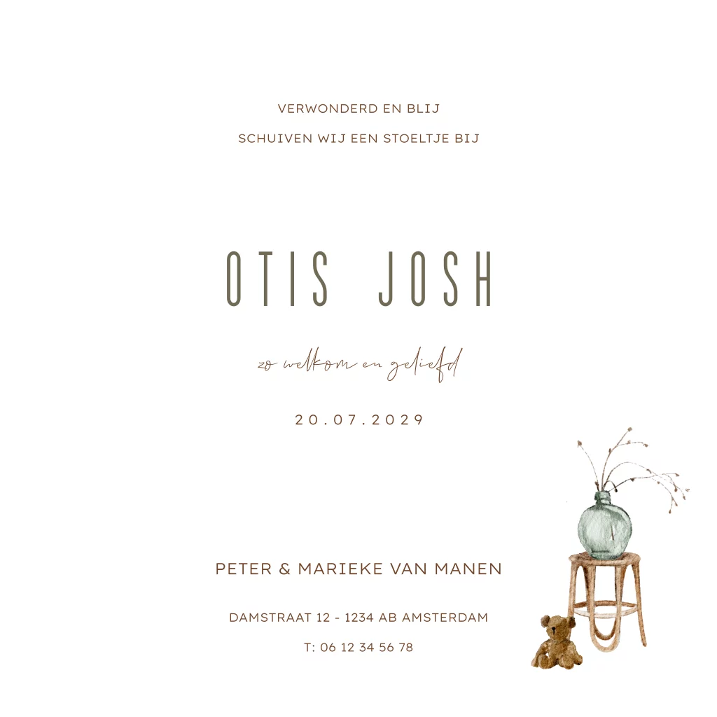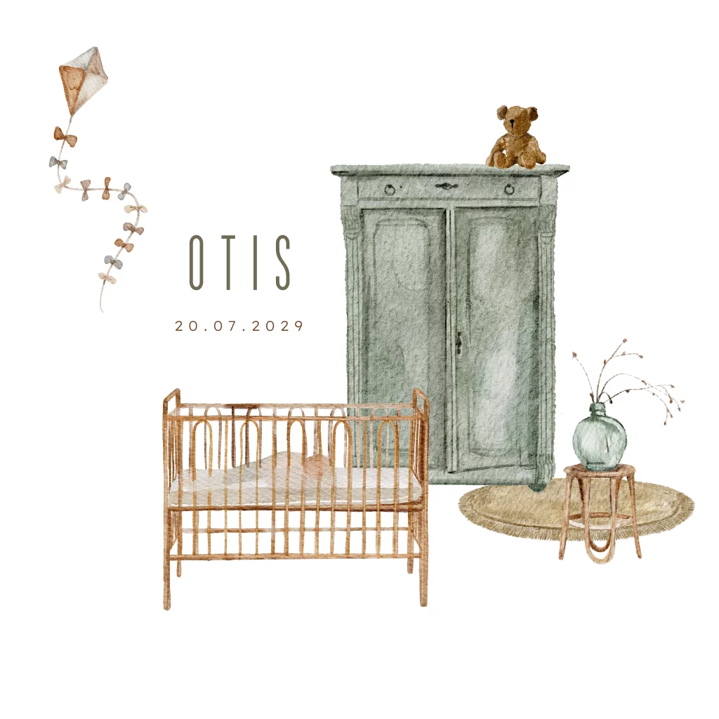 Geboortekaartje voor een zoon met prachtige illustraties. In het wiegje ligt een baby en daarbij staan illustraties van een kinderkamer en een vrolijke vlieger. Dit kaartje kan je zelf helemaal aanpassen.