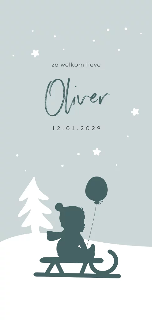 Winter geboortekaartje met een silhouet van een jongen op een slee. In zijn hand houdt hij een ballon. De achtergrond is blauw met kleine stippen en sterretjes.