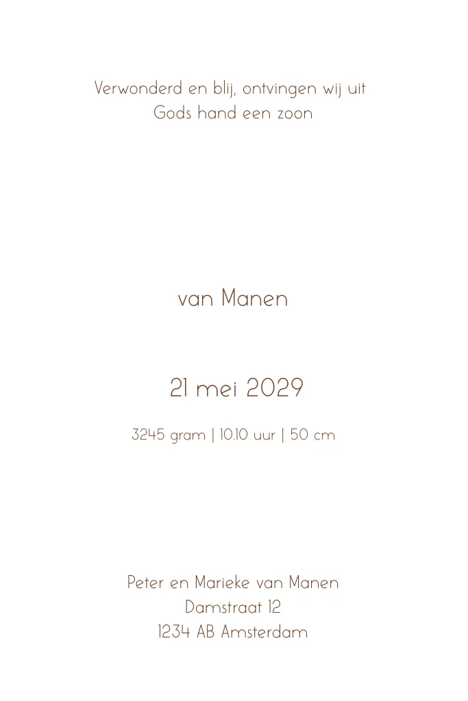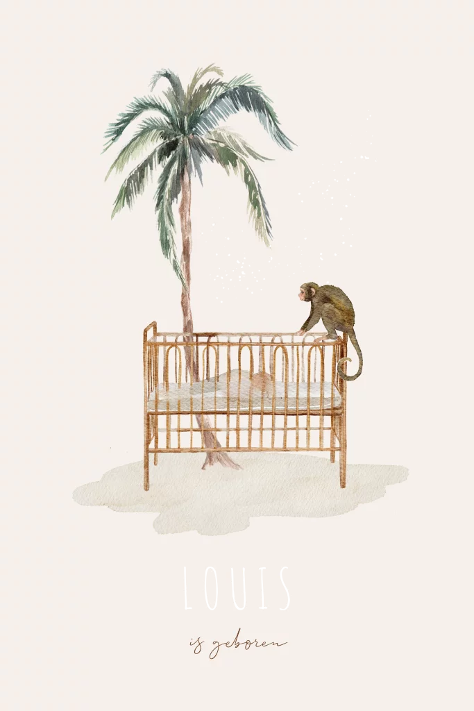 Lief geboortekaartje met een jungle thema. Bij de palmboom staat een ledikantje met een aapje erop. De naam en kleine spetters worden gedrukt in goudfolie. Dit geboortekaartje is dubbel en heeft een creme achtergrond.