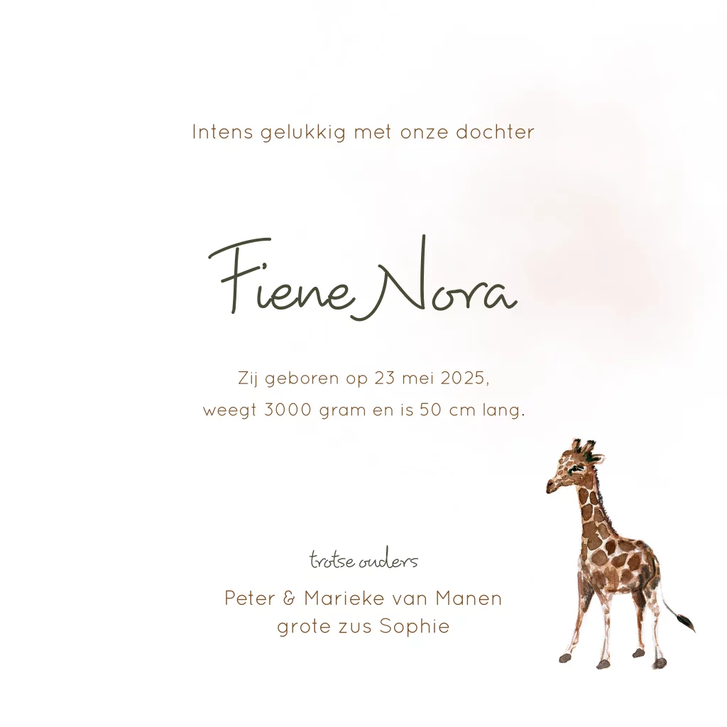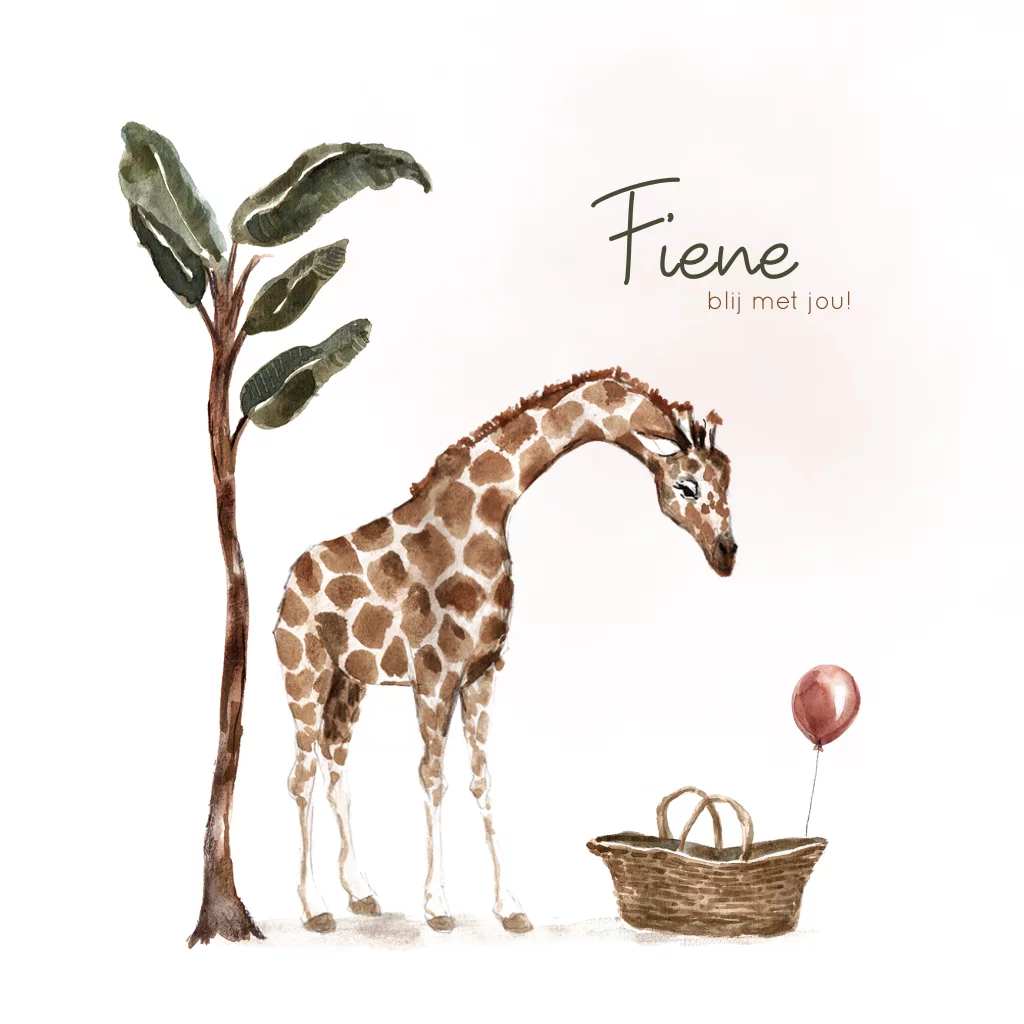 Lief geboortekaartje voor een meisje met een illustratie van een giraf die in een mandje kijkt. Aan het babymandje hangt een vrolijke roze ballon.