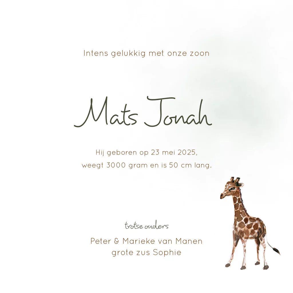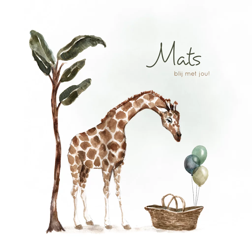 Handgetekend geboortekaartje met een illustratie van een giraffe die in een baby mandje kijkt. Aan het mandje hangen groene ballonnen.