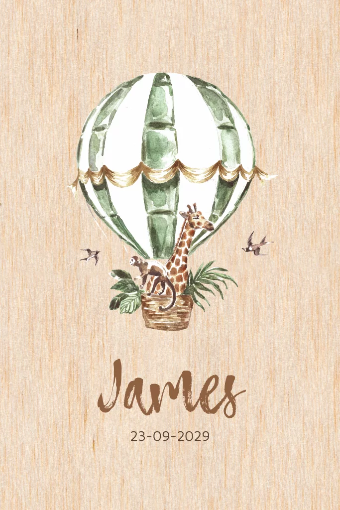 Dit geboortekaartje wordt gedrukt op echt berkenhout. Op het kaartje staat een luchtballon in groene tinten met een giraffe en een aapje in de mand.
