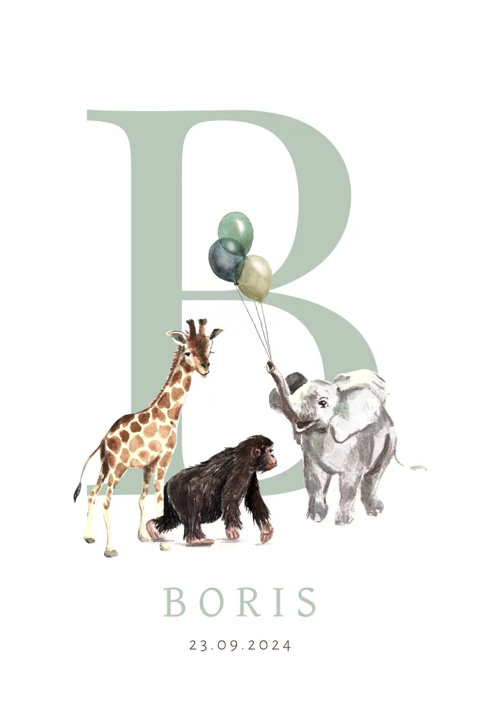 Vrolijk geboortekaartje met groene initiaal en jungledieren