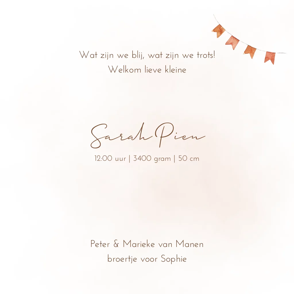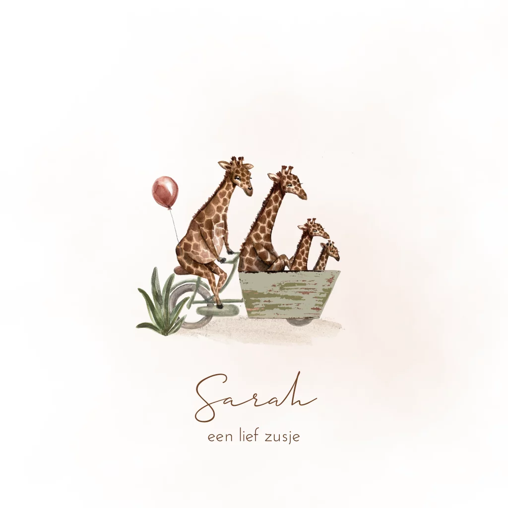 Krijgen jullie een tweede kindje en hou je van giraffen? Dan is dit geboortekaartje echt een leukerd voor jullie dochter. De giraffen zitten op een bakfiets en in de bak zitten twee kleintjes. De achtergrond heeft een zachtroze waterverf en achterop de fiets hangt een rode ballon.