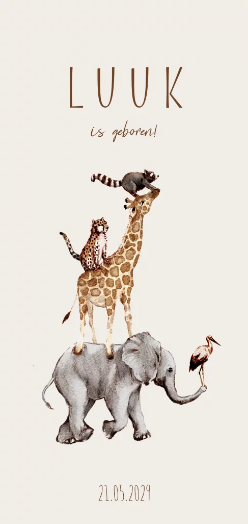 Geboortekaartje voor een jongen met een vrolijke stapel jungledieren. Een olifant, giraffe, cheetah, ooievaar en een wasbeer. Alle dieren zijn met de hand getekend. Ook mooi om te combineren met goudfolie.