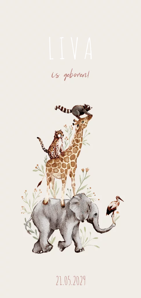 Een leuk geboortekaartje voor een meisje met een handgetekende stapel jungledieren. Op het kaartje zie je een giraffe, wasbeer, olifant, luipaard en een wasbeer.