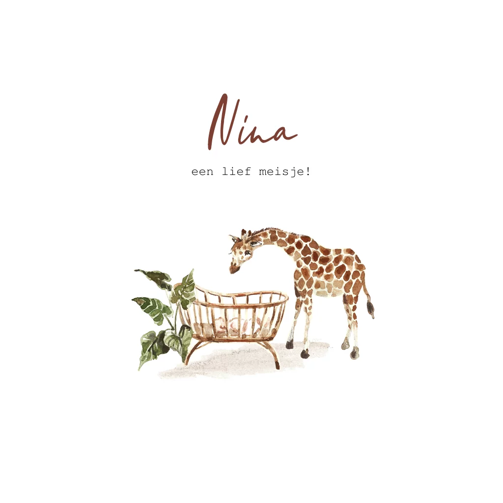 Schattig geboortekaartje voor een klein meisje. De getekende giraffe kijkt in een rotan wiegje. Daarom heen staan groene bladeren. De wieg komt aan de achterkant ook weer terug. De ronde hoeken op dit kaartje maken het kaartje heel lieflijk en zacht.