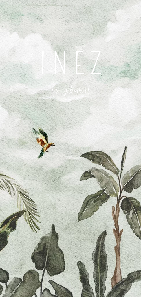 Een mooi junglekaartje met een papegaai en goudfolie. Andere foliesoorten zijn ook mogelijk bij dit schattige staande geboortekaartje. De achtergrond is van groene waterverf en in de lucht vliegt een papegaai.