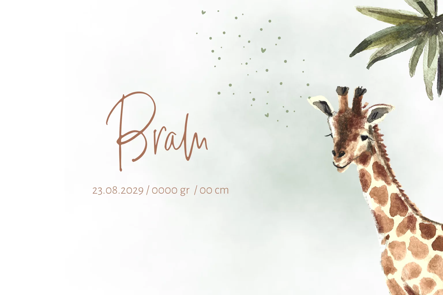 Dit geboortekaartje heeft een getekende giraf die om een hoekje kijkt. Op het kaartje staat ook een deel van een boom en groene watercolor op de achtergrond. Pas dit jungle kaartje zelf helemaal aan.