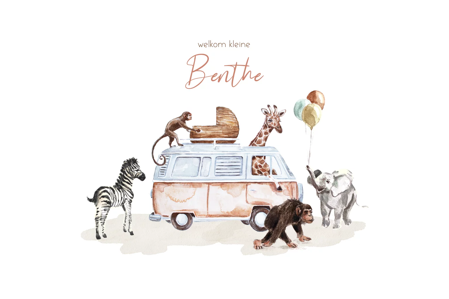 Origineel geboortekaartje meisje met volkswagenbus en jungledieren