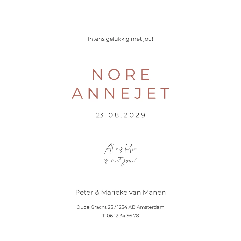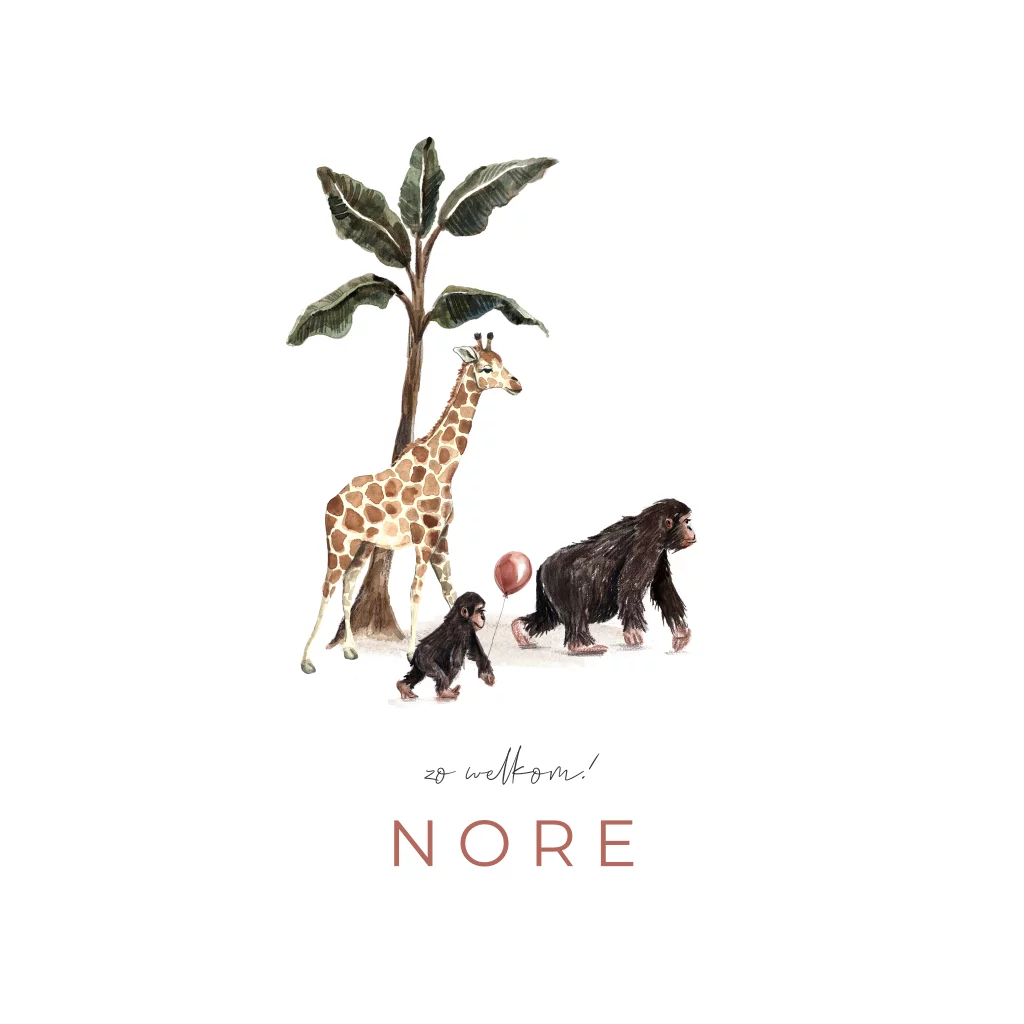 Vierkant geboortekaartje met een vrolijke uitstraling. De jungledieren lopen achter elkaar en het kleine aapje heeft een roze ballon. De giraffe en de grote aap lopen achter elkaar aan. Dit kaartje kan je zelf helemaal aanpassen in de editor.