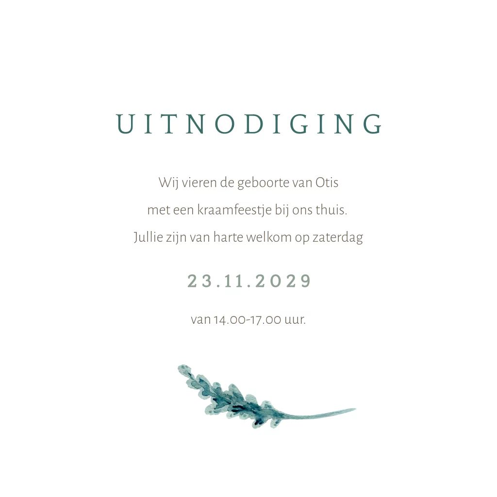 Nodig gasten uit voor een kraamfeest met dit vierkante kaartje. Onderaan staat een blauwe lavendel tak. Bij dit kaartje hebben we ook een bijpassend geboortekaartje.