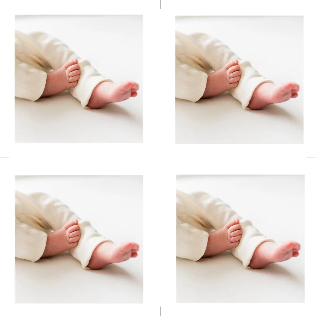 Vierkante kaart met daarop 4 foto's. Vervang de foto door een mooie foto van jullie kindje, bestel de kaart en snijd de kaart thuis doormidden.