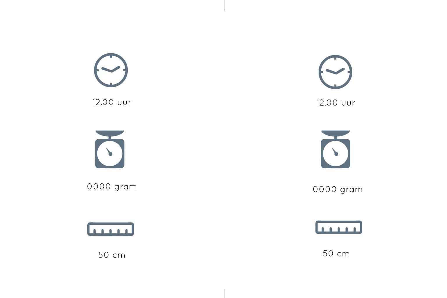Enkel kaartje met DIY labels voor je geboortekaartje. Op de labels staan blauwe icoontjes met de geboortegegevens voor jullie zoontje. Pas de gegevens aan, bestel een proefdruk en snijd of knip het kaartje thuis nog doormidden.