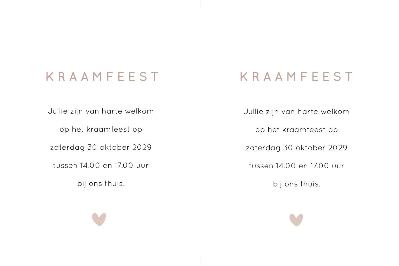 Dit kaartje bevat twee labels met een uitnodiging voor een kraamfeest. Het is een DIY label, je moet het kaartje thuis nog even doormidden snijden of knippen. Maak het kaartje in dezelfde stijl en lettertypes als het geboortekaartje voor een mooi geheel.