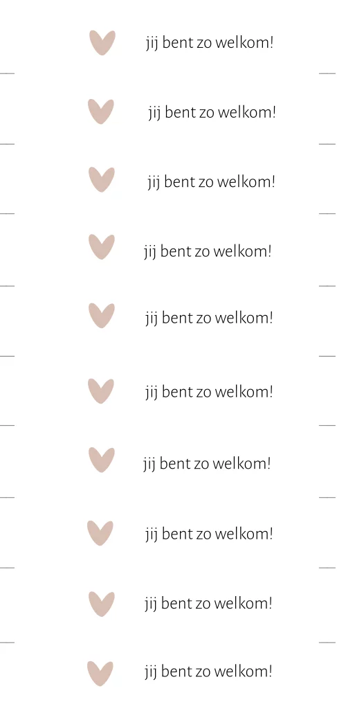 DIY labels met de tekst 'jij bent zo welkom' en een roze hartje. De tekst en afbeelding kan je naar wens aanpassen. Op de kaart staan 10 labels die je zelf thuis nog door moet snijden of knippen. Maak een gaatje in de labels en hang aan je kaartje met een touwtje of lint. Je kunt hem ook vastmaken met een paperclip.