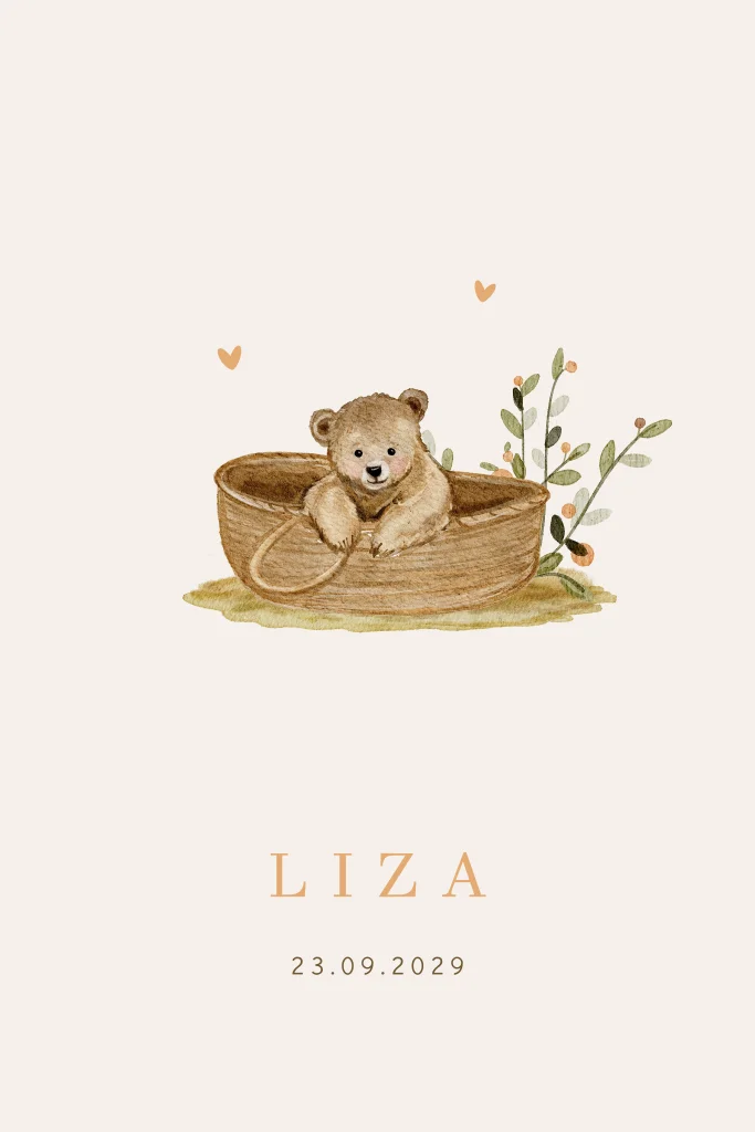 Dit is ook een mooi kaartje uit de collectie van getekende geboortekaartjes. Dit prachtige kaartje voor een meisje toont een schattige beer in een mandje, omringd door weelderig gras. De creme achtergrond en de hartjes accenten geven dit kaartje een zachte en lieve uitstraling. Dit kaartje is perfect voor een meisje, maar je kunt de kleuren ook aanpassen zodat het voor een jongen is. De illustratieve stijl en het thema van de natuur maken dit kaartje geschikt voor avontuurlijke en natuur-liefhebbende ouders. Dit geboortekaartje is volledig aanpasbaar, waardoor je de mogelijkheid hebt om het kaartje naar wens te bewerken. Voeg je eigen persoonlijke touch toe en maak het kaartje uniek voor de komst van jullie kleintje.
