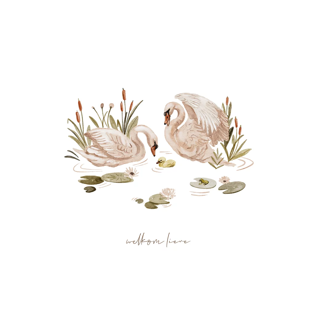 Lief getekend geboortekaartje voor een meisje met een vijver met zwanen. Bij de zwanen zwemt een lief klein eendje. Je kunt dit kaartje helemaal zelf aanpassen. Je kan het roséfolie aanpassen naar andere kleuren folie. Je kan bijvoorbeeld meerdere eendjes toevoegen als broertjes of zusjes, of een krokodil die ze allemaal opvreet. Wat jij wil!