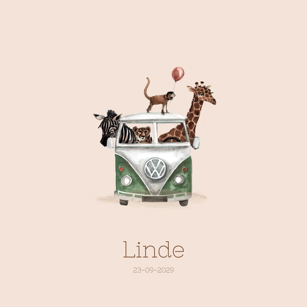 Getekend geboortekaartje met jungledieren in busje