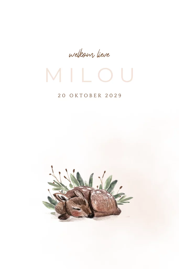 Illustratief geboortekaartje met een tekening van een slapend hertje. Daar achter zie je groene en bruine takjes. Op de achtergrond is heel licht een roze waterverf te zien.