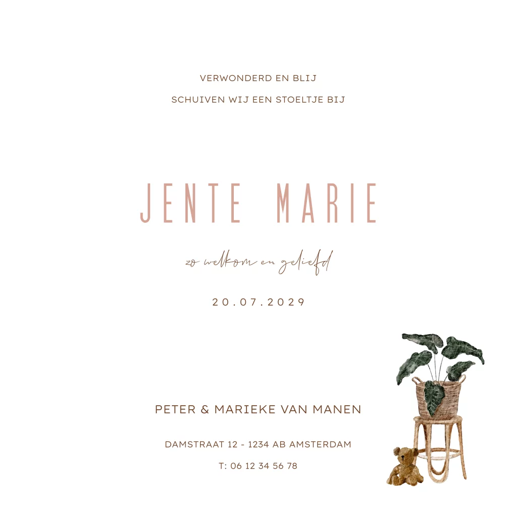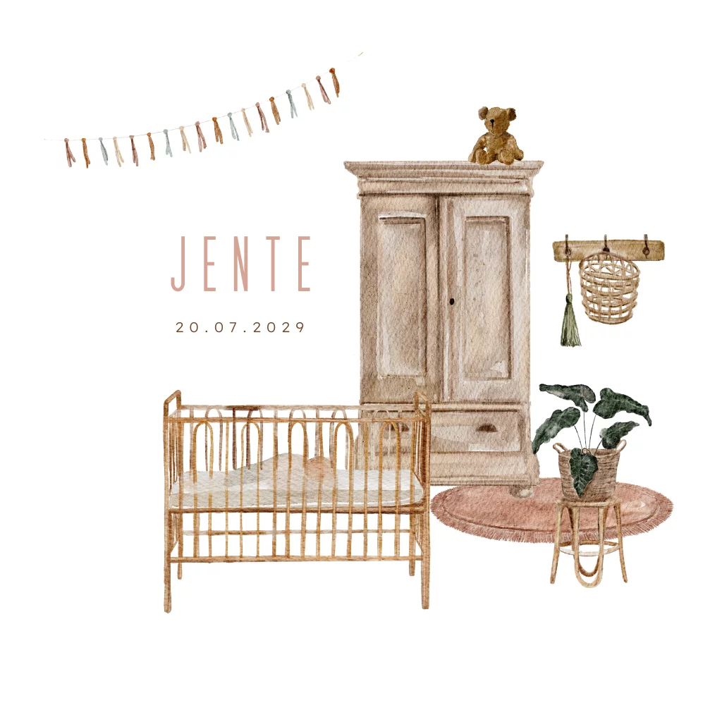 Lief geboortekaartje met een wiegje en een baby. De illustraties zijn van een kinderkamer met vrolijke slingers en een beer op een kast. Dit kaartje kan je zelf helemaal aanpassen.