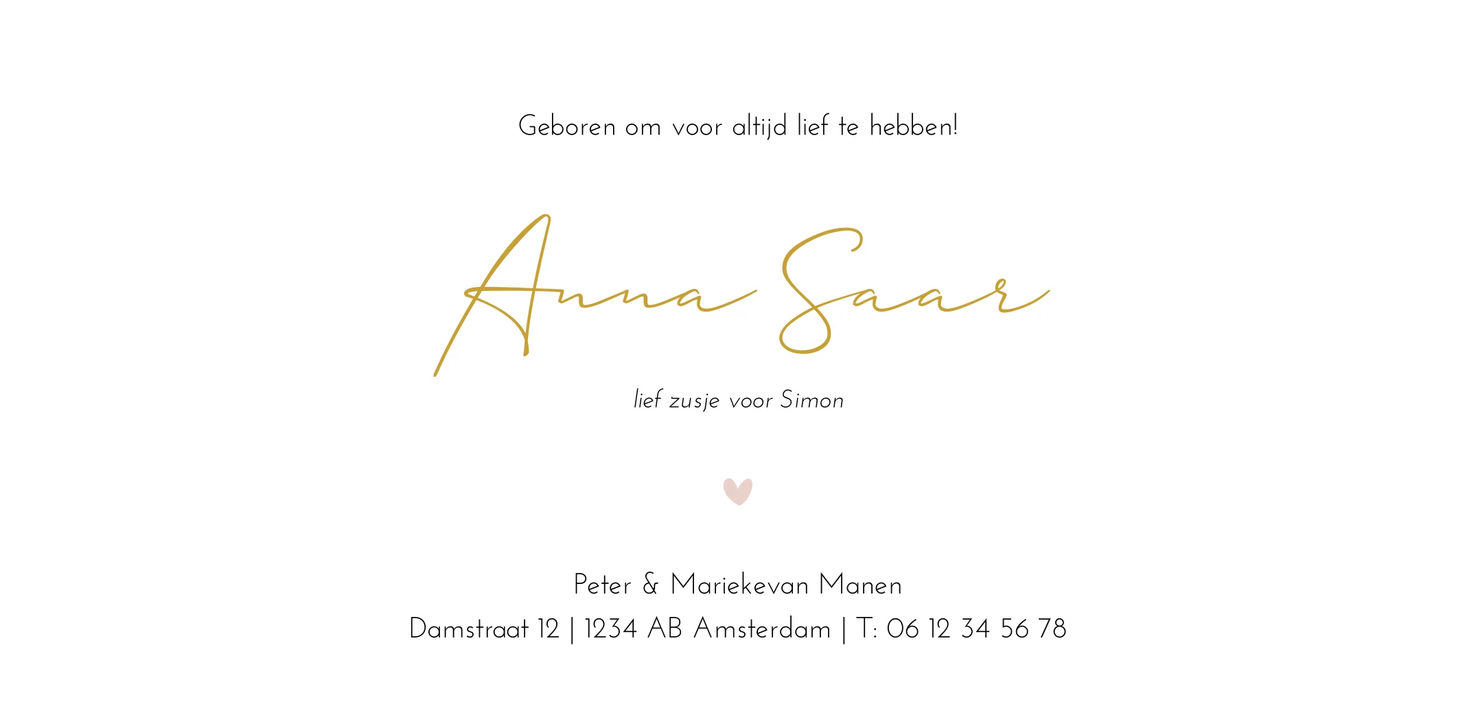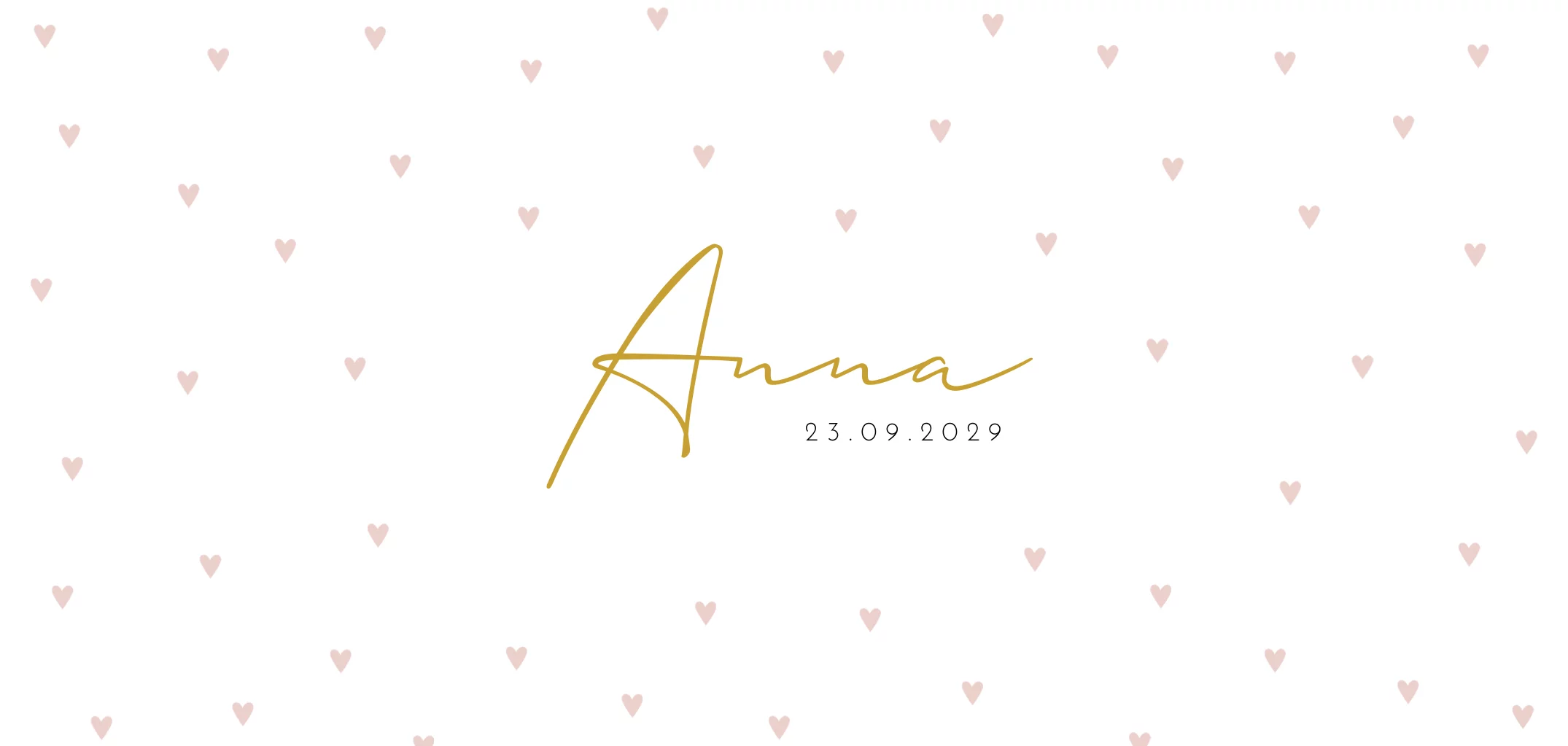 Liggend geboortekaartje met een achtergrond van kleine roze hartjes. De naam staat in okergeel. Lief kaartje voor een klein meisje.