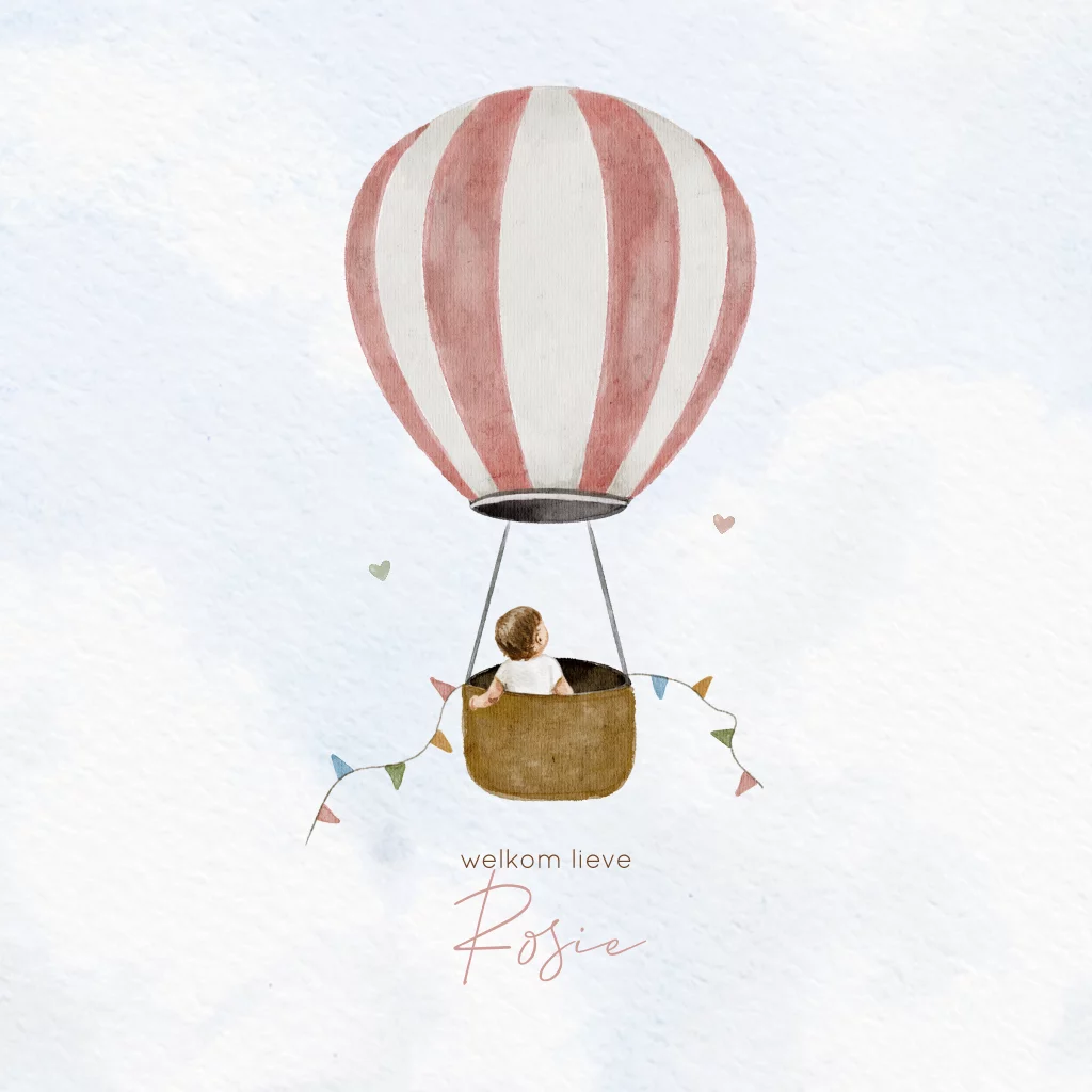 Prachtig getekend geboortekaartje voor de zomer. De achtergrond heeft een mooie aquarel lucht en in de lucht vliegt een roze luchtballon met witte strepen. In het mandje van de ballon zit een meisje. De vrolijk gekleurde vlaggen maken dit kaartje voor jullie dochter helemaal af.