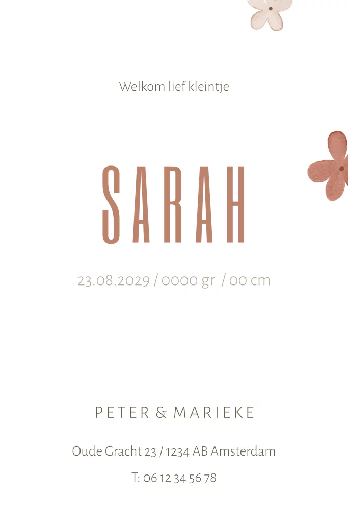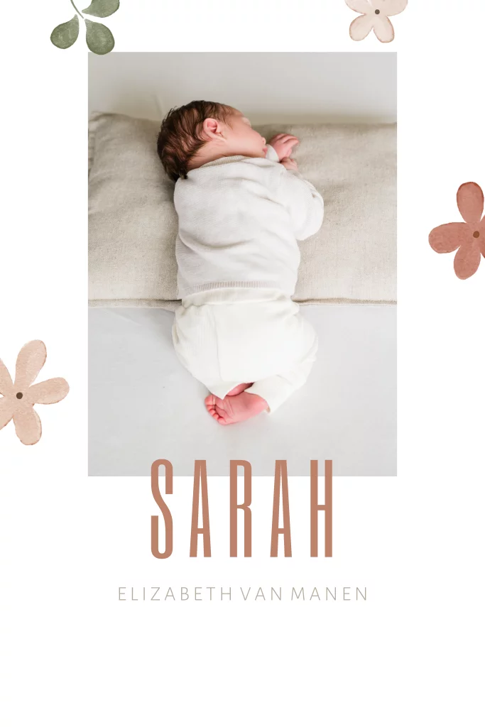 Geboortekaartje voor een meisje met een eigen foto. Daaromheen staan roze en groene bloemetjes. Vervang de foto door een eigen foto van jullie pasgeboren dochter. Fotografie: Monica Stout