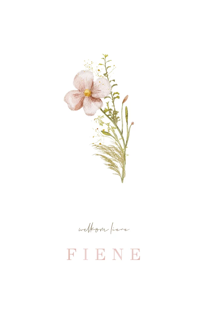Wat een mooi getekend geboortekaartje is dit. De aquarel illustratie bevat veldboeket bloemen in roze en groene tinten. De naam wordt gedrukt in UV spotlak, dat ligt op het kaartje en heeft een glas letter. Leuk voor een lentekindje of zomer baby. Maak dit lieve kaartje voor een meisje zelf af.