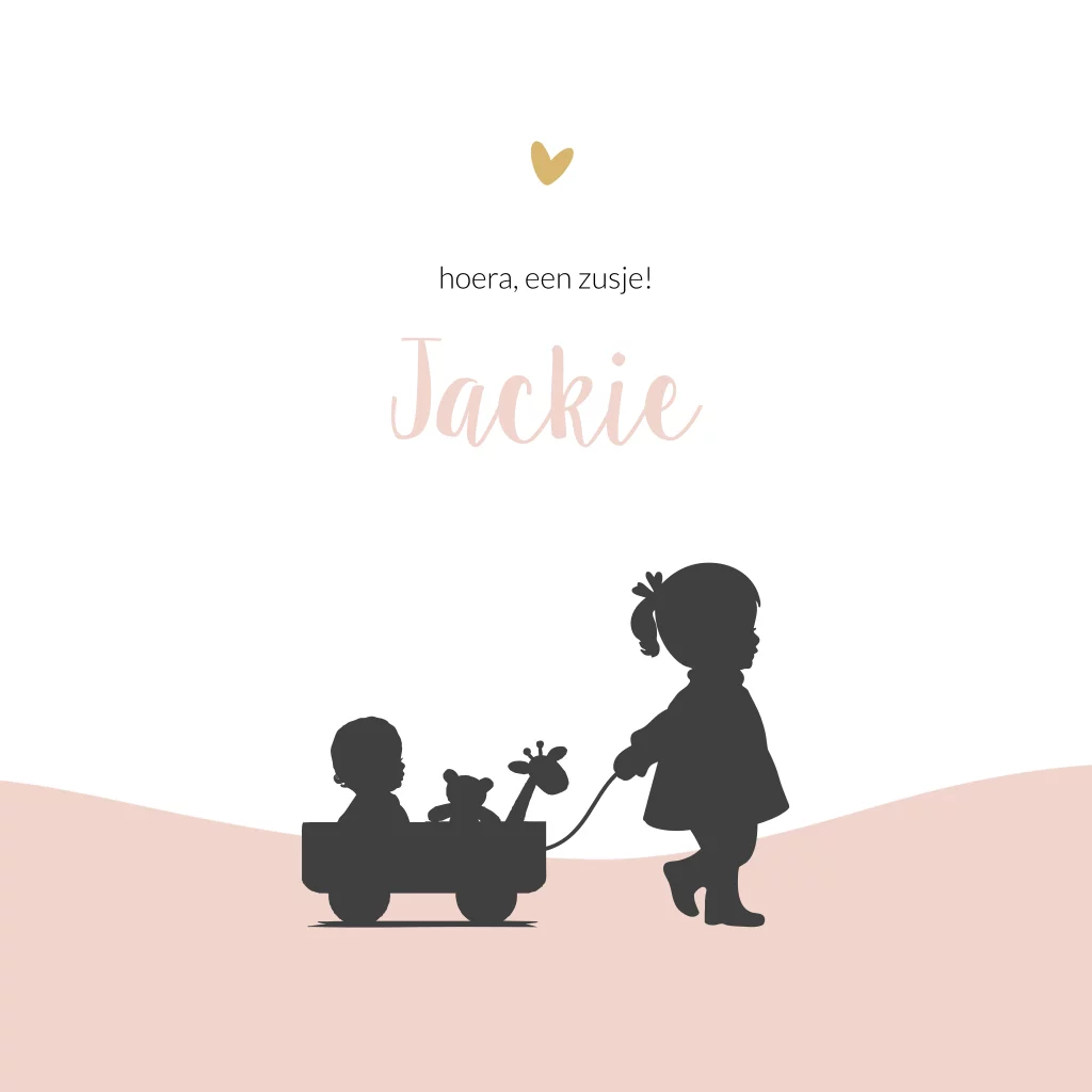 Geboortekaartje met een silhouet van een grote zus met een baby in een kar. De ondergrond is roze en een klein geel hartje. De zus trekt het zusje in de speelgoedkar met een touwtje.