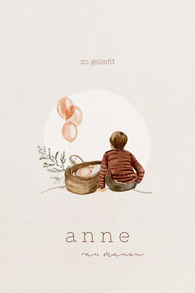 Origineel getekend geboortekaartje voor een meisje. Dit kaartje heeft een achtergrond van aquarel papierlook en daarop een illustratie van een broer bij een babymandje. De ballonnen maken het kaartje extra feestelijk.
