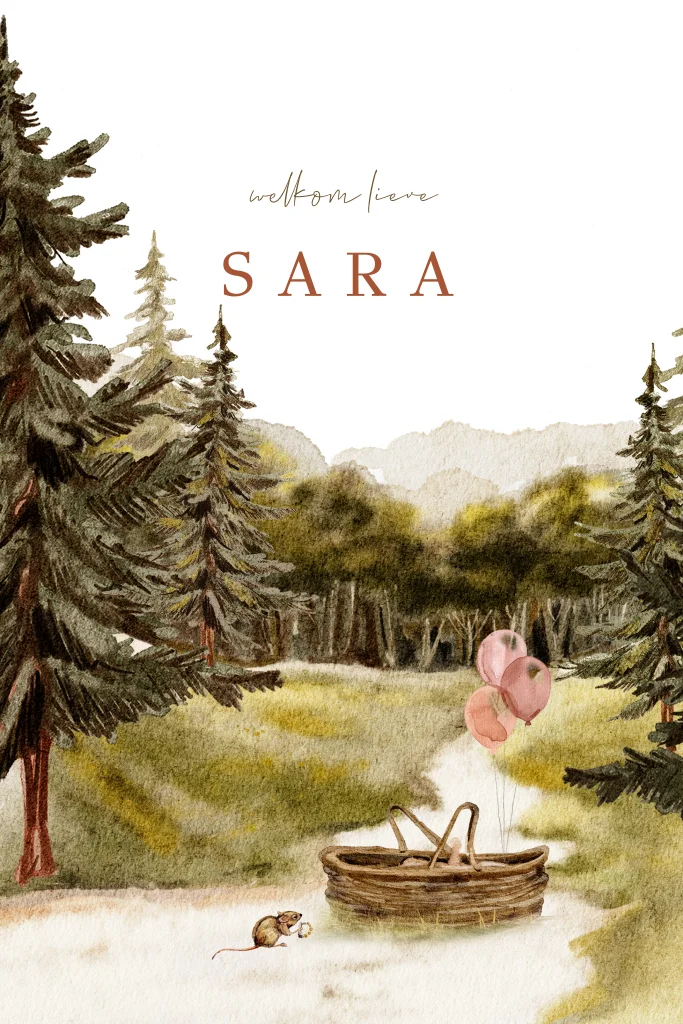 Wat een mooi getekend geboortekaartje is dit. Op de achtergrond is een bos getekend met dennenbomen. Op de voorgrond staat een baby in een mandje met roze ballonnen en een muisje. Je kunt dit kaartje zelf bewerken en aanpassen.