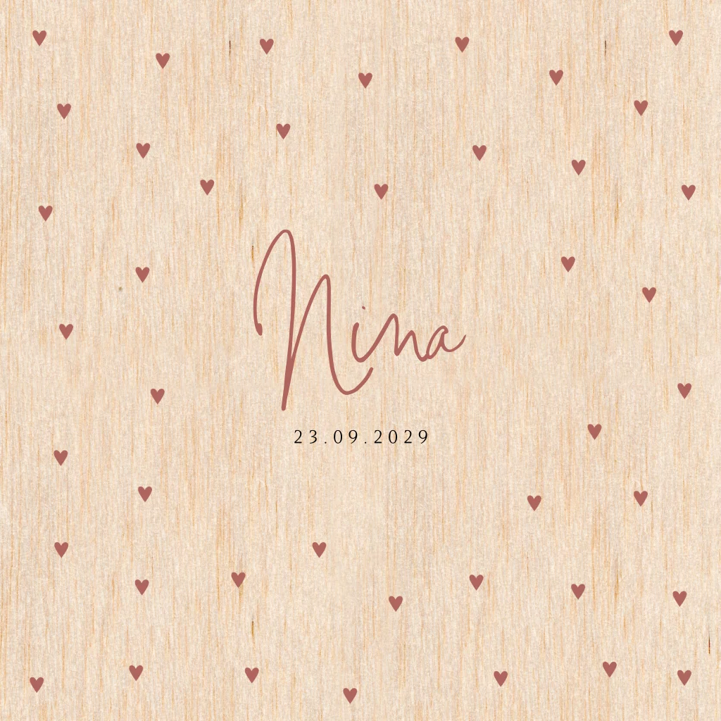 Lief geboortekaartje voor een meisje gedrukt op echt hout. Het vierkante kaartje heeft kleine hartjes rondom en in het midden staat de naam. Hartjes en kleuren kan je zelf aanpassen.